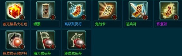 首充精品大礼包:资质成长保护丹1个、潜力、资质成长丹各5个、恢复符5张、征兵10张、免战卡5张、银票3张、高级聚灵符5张。