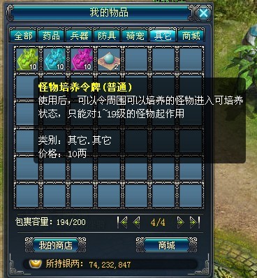 怪物的培养需要使用各种道具,如:怪物培养令牌、回血丹等,所有的道具只能在普通副本中使用,他们分别对怪物起到不同的作用: