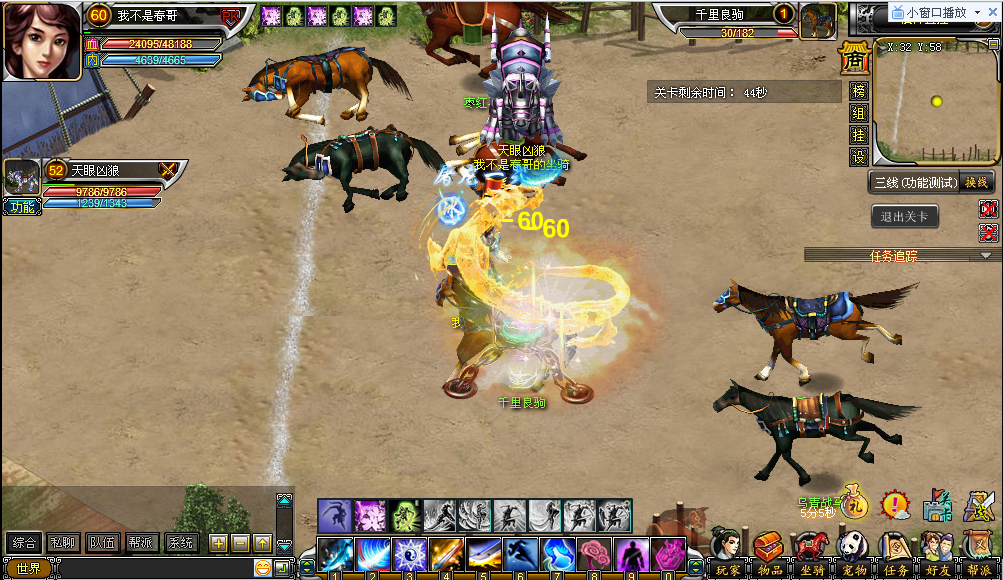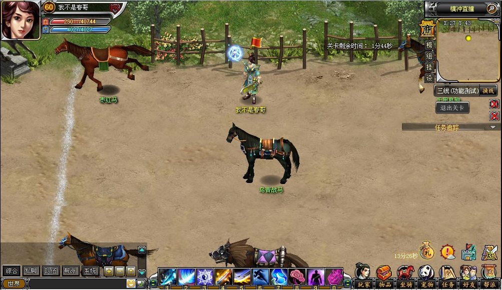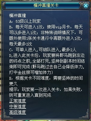 横冲直闯关卡要求玩家的等级为32级以上,每位一个角色每天可以闯关1次,但是使用vip月卡的玩家每天可多闯1次。玩家可单人进入,可以组队进入,但是最多只可以两个人组队哦。进入此关卡后,会看到一群野马从旁边跑出来,玩家需要在野马跑到生命线之前将野马打死,坚守了规定的时间,就算完成任务。